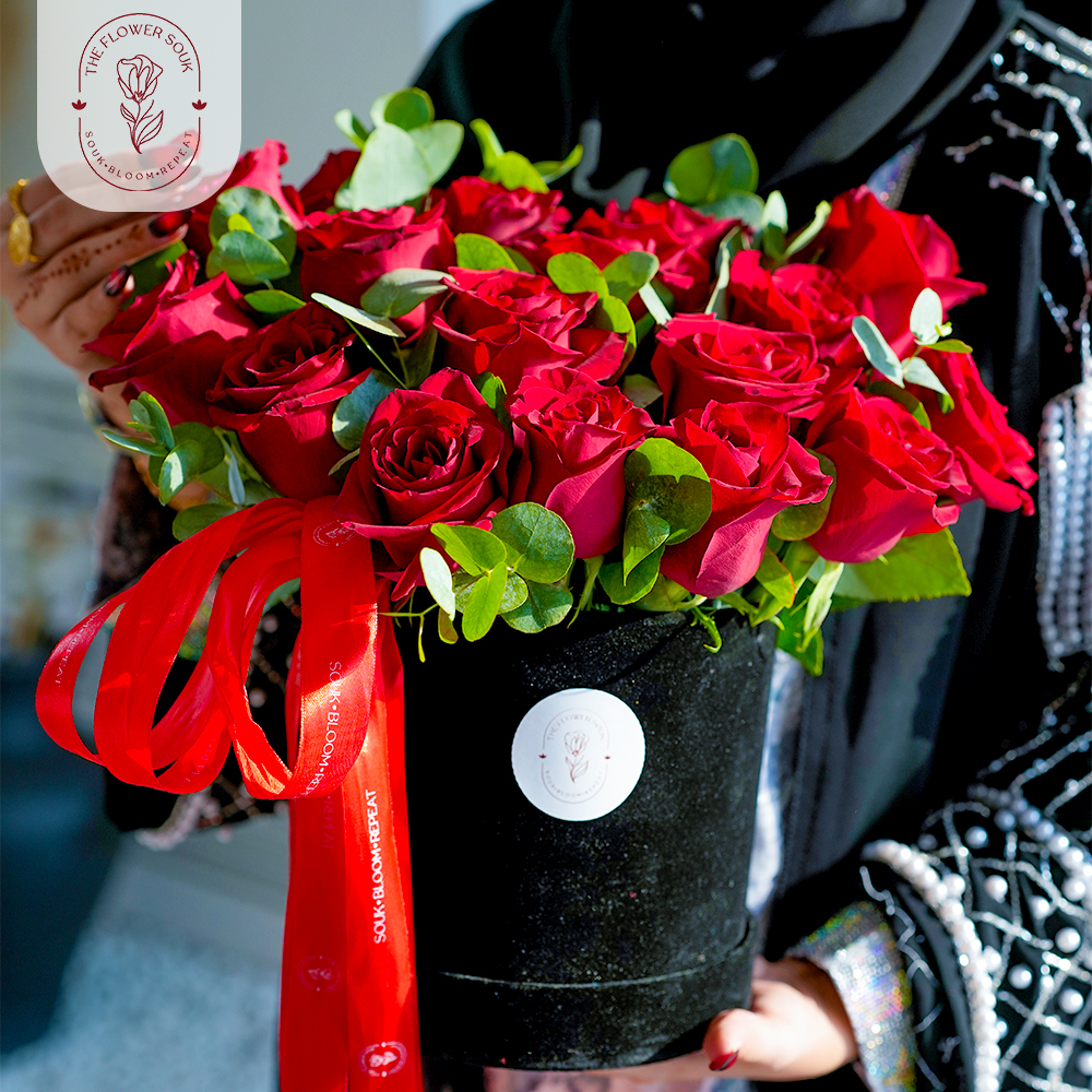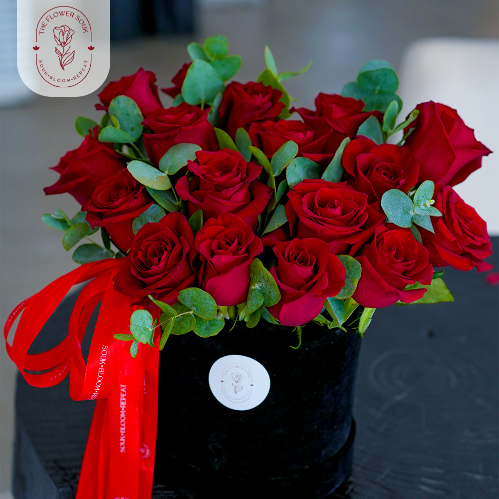 A luxurious arrangement of 20 deep red roses paired with fresh eucalyptus greenery, presented in a medium round black box with a bold ribbon. 🌹✨